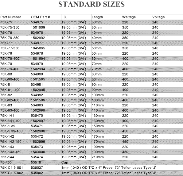 Mini Coil Heaters Mini coil heaters or mini band heaters lend themselves to a variety of applications. The most common application is nozzle heaters for hot runner manifolds. We have available a complete line of OEM replacement heaters for Husky, Tradesco and others. Below we have listed the most common sizes. |